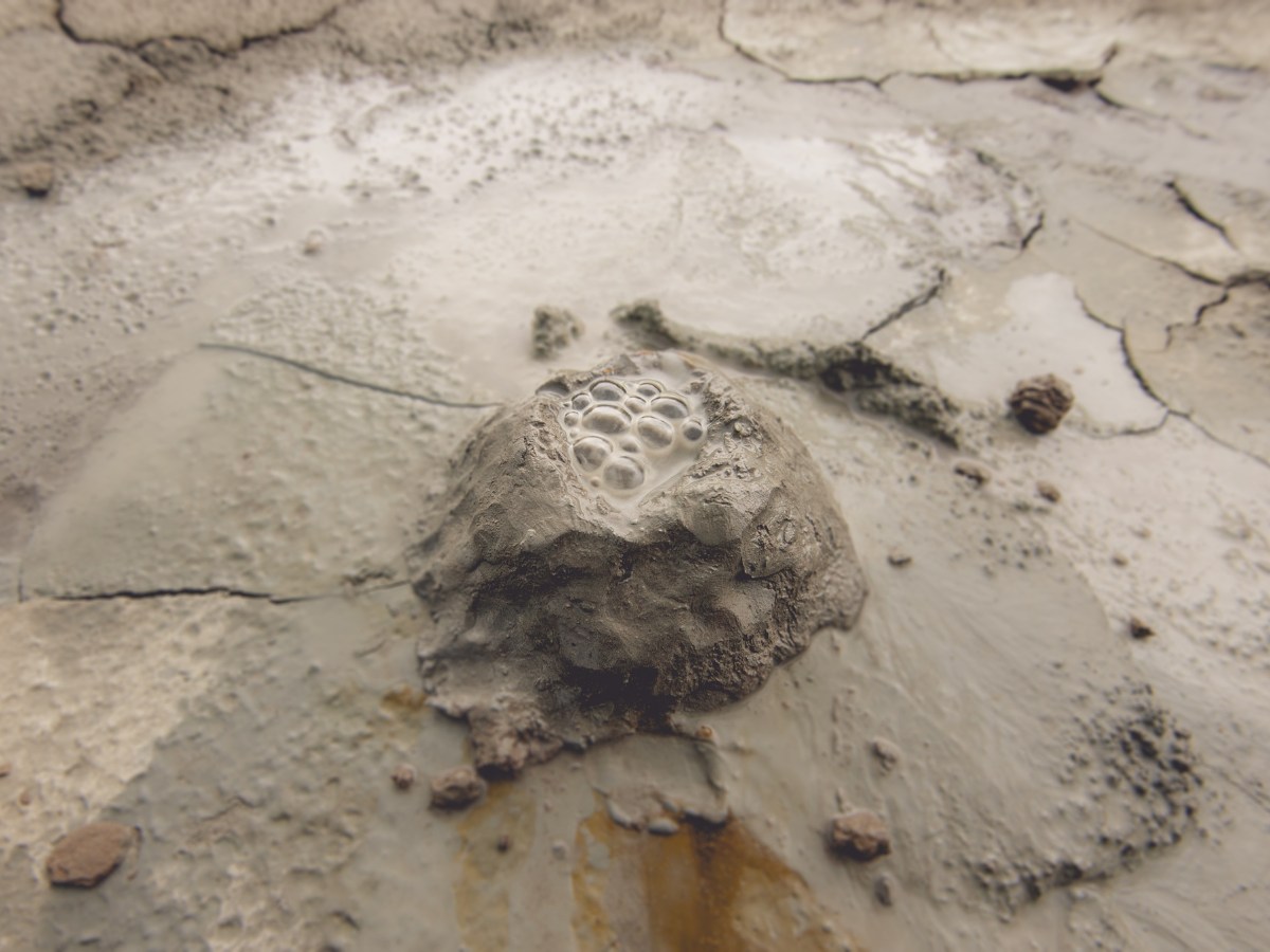 A pochi centimetri dalle assi di legno, si osservano le polle ribollenti. Il gas metano, liberandosi dalla morsa dell’argilla, genera bolle che scoppiano con un rumore sordo, un “puf” ritmico che i locali chiamano barboj. Ogni esplosione solleva piccoli schizzi di fango grigio che, accumulo dopo accumulo, edificano i coni circostanti.