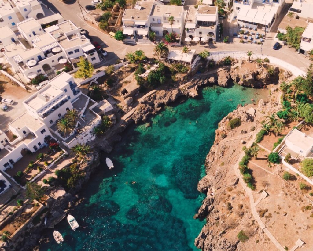 A pochi minuti da Chora scende Kapsali, il vecchio porto dell’isola, con la sua doppia baia divisa da un istmo. Una parte è sabbiosa e attrezzata, l’altra di ciottoli e libera. L’acqua è turchese, il fondale digrada lentamente. È la spiaggia più frequentata dell’isola — il che, rapportato agli standard di luglio a Santorini, significa avere abbastanza spazio per stendersi senza toccare il vicino.