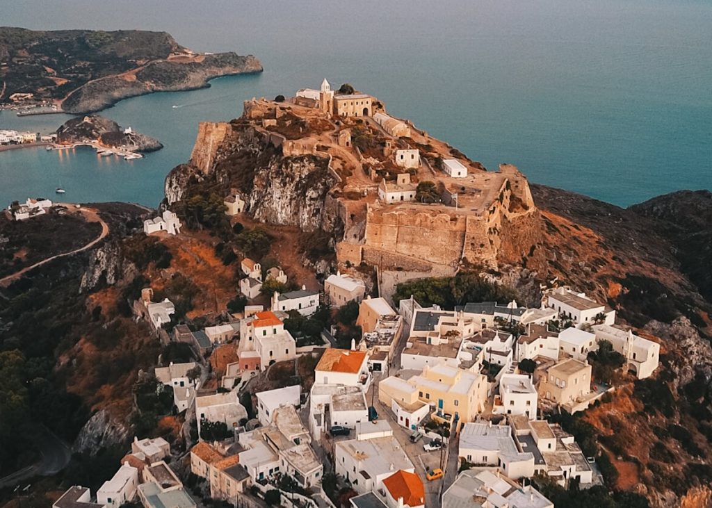 Il punto di partenza è Chora, il capoluogo arroccato a sud dell’isola su una cresta che termina con un castello veneziano del XVI secolo. La struttura originale serviva come difesa dai pirati — il cui problema nel Mediterraneo del ‘500 era molto più concreto di quanto si immagini. Oggi dalla sommità del castello la vista spazia su tutto il Mar Egeo meridionale in un silenzio quasi totale.