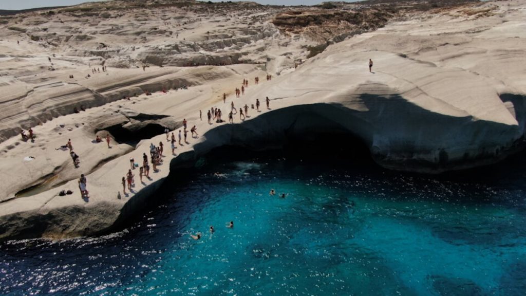 Non è una spiaggia nel senso tradizionale. Sarakiniko è un plateau di roccia vulcanica bianca — tecnicamente perlite — erosa dal vento e dal mare in forme morbide e geometriche che ricordano davvero la superficie lunare. L’acqua che si insinua tra queste formazioni è di un turchese intenso che contrasta con il bianco abbagliante della roccia. Si tuffano dai bordi, si nuota in piccole calette protette, si esplorano tunnel scavati nel tufo.