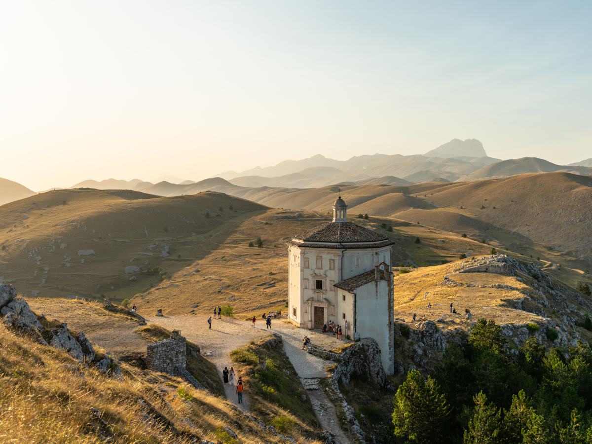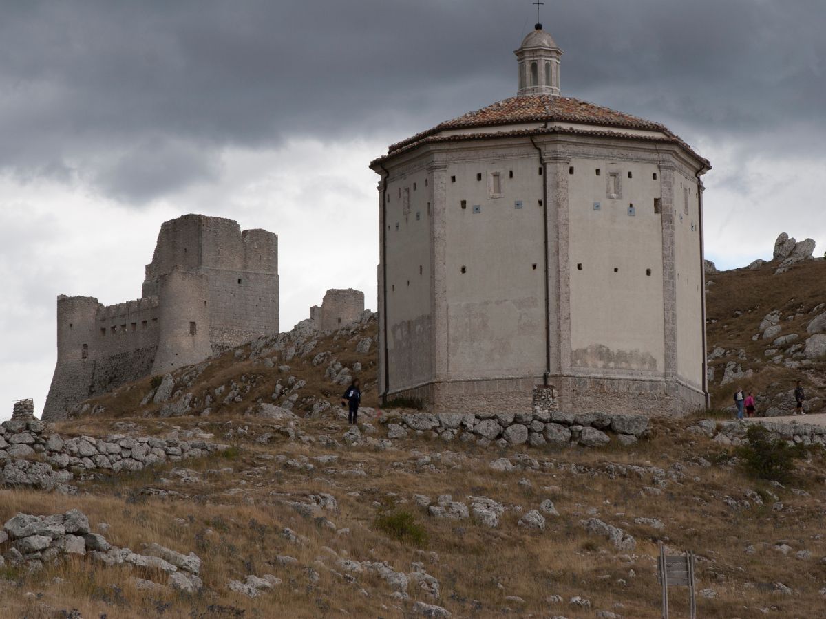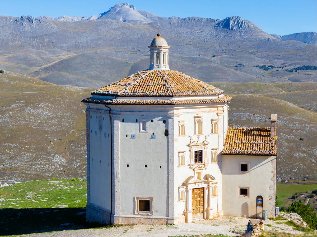 Ci troviamo a circa 1500 metri di quota, su un pianoro che domina la piana di Navelli e l’antico tratturo, la storica autostrada d’erba usata un tempo dai pastori per la transumanza. Il contesto geografico è aspro, selvaggio, eppure questo tempietto appare come un miraggio di rara eleganza, posizionato a pochi passi dalle rovine del castello più alto d’Italia.