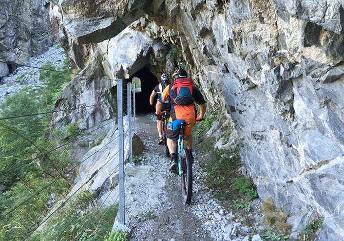 Il tracciato venne infatti aperto 80 anni fa, negli anni Trenta del Novecento, come infrastruttura di servizio per il trasporto delle merci e di collegamento tra due dighe, una in Val Codera e l’altra in Val dei Ratti: la lunghezza complessiva del sentiero del Tracciolino è di circa 14 km, ma al momento sono solo 8 quelli messi in sicurezza e percorribili anche dalle mountain bike: è il tratto più spettacolare, quello da Novate Mezzola a San Giorgio, caratterizzato da gallerie scavate nella roccia e da una decauville, lo storico binario per il trasporto delle merci.