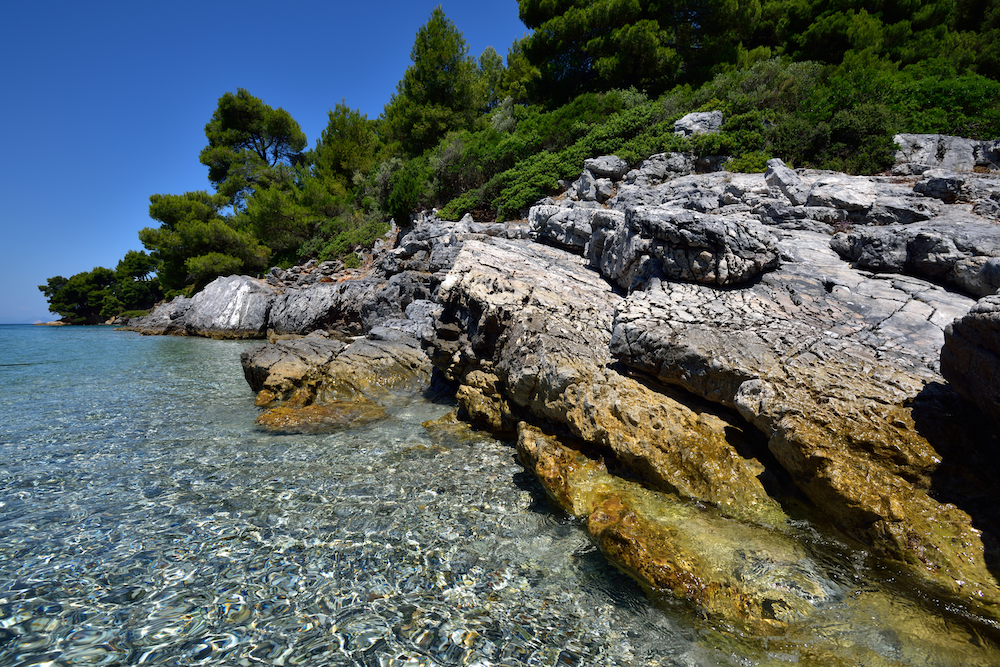 È diventata famosa per il film Mamma Mia!, ma la realtà è diversa da quella da cartolina cinematografica: colline ricoperte di pini, strade che scendono verso baie di ciottoli bianchi, acqua trasparente e profonda.
